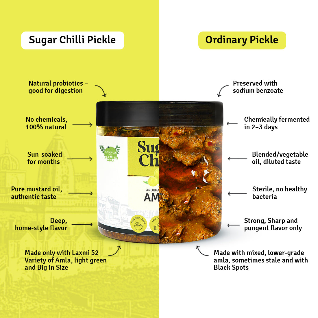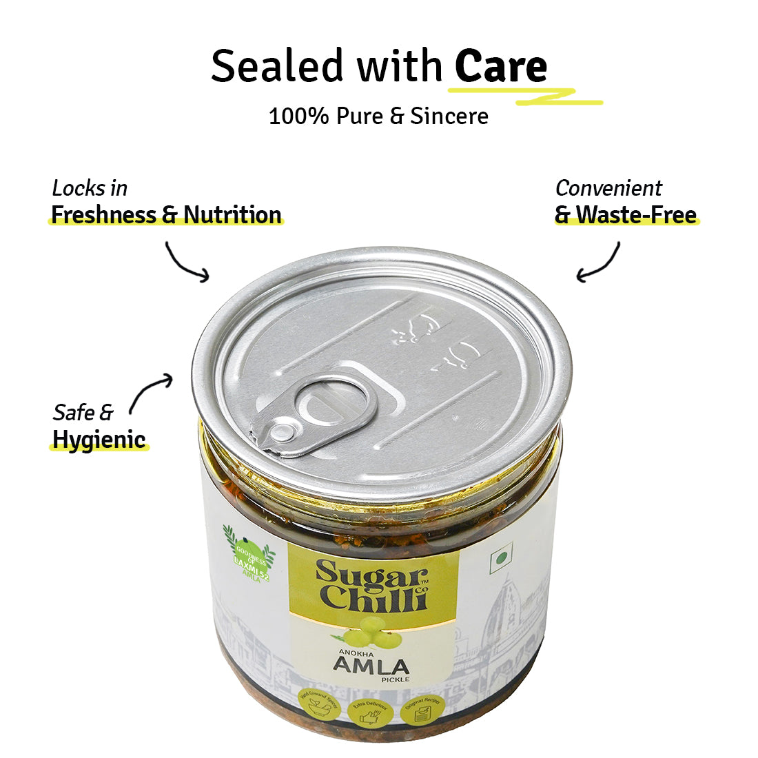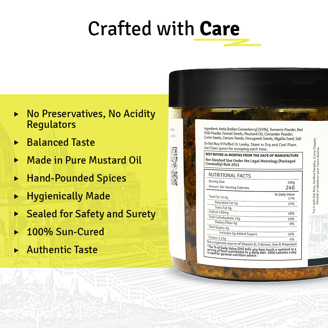 Our Farm-Fresh Amla is sourced from Pratapgarh District of Uttar Pradesh, a place known to have the best quality and varieties in the entire country. The lustrous Green fruit is widely known to have several health benefits like building Immunity and also aids in digestion. This Indian Gooseberry Pickle is made by Farm-Fresh Amla which are mixed with hand-pounded spices after Steaming, De-seeding and sun-drying. This Masaale-daar Pickle is considered to be very good for building Immunity and also aids in digestion. Tastes heavenly with paird with Poori-Sabji, Plain or Stuffed Parantha.