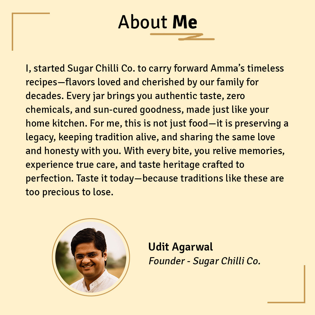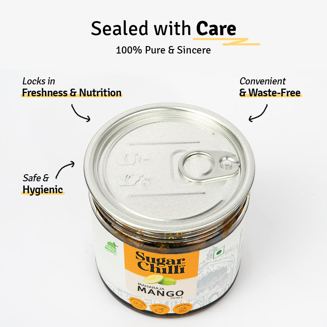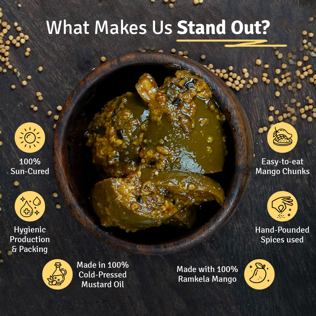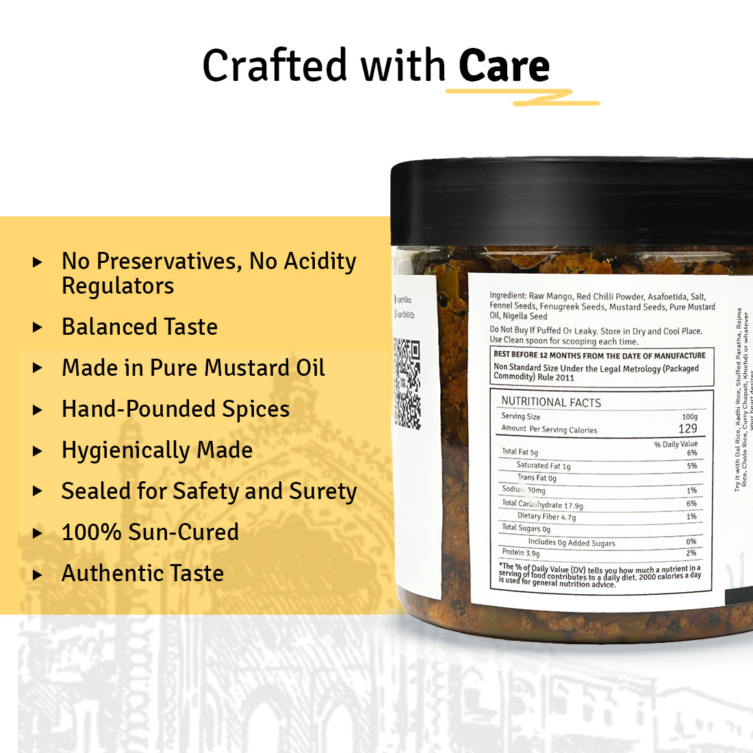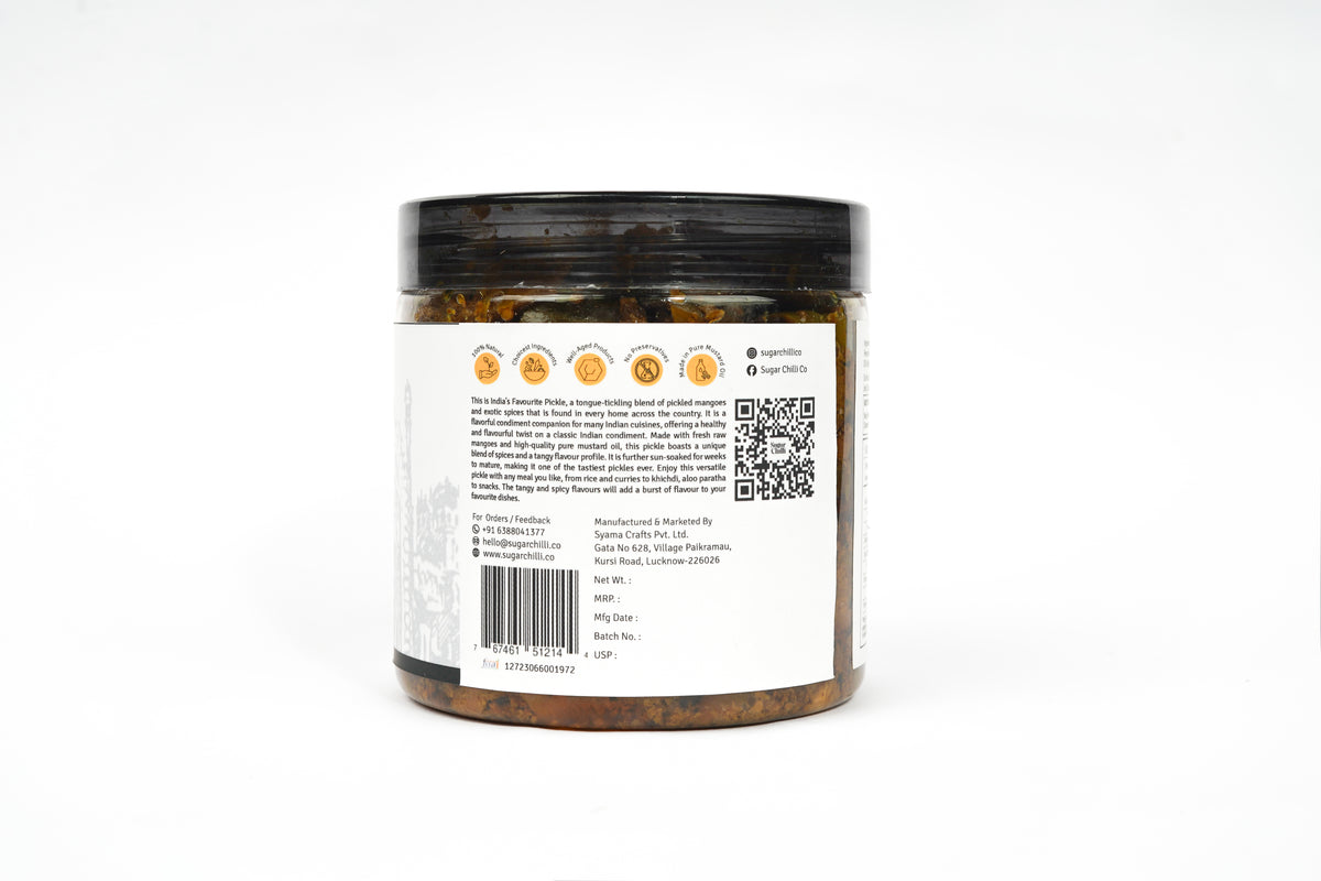Ingredients – Raw Mango, Red Chilli Powder, Asafoetida, Salt, Fennel seeds, Fenugreek Seeds, Mustard Seeds Pure Mustard oil, Nigella Seeds
